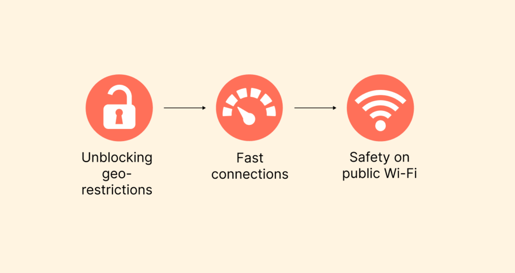- Safety on public Wi-Fi: The internet is full of bad actors, and one wrong click might get you in trouble. Public Wi-Fi is considered a notorious hunting ground for hackers and other bad actors. A VPN protects you from scammers on public Wi-Fi by encrypting your data, making it inaccessible. Some other top features, like a kill switch and DNS leak protection, ensure your safety and privacy on public Wi-Fi.