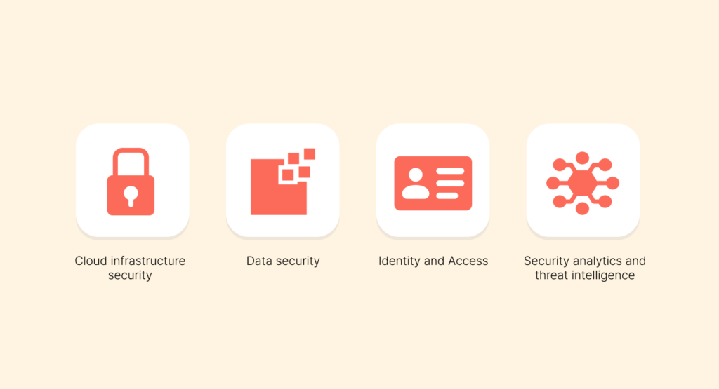- Cloud infrastructure security: This includes the security of the primary infrastructure of the cloud provider. It can include secure firewalls, intrusion detection systems, vulnerability management, and other information security requirements to secure the servers, networks, and data centers where cloud resources exist.