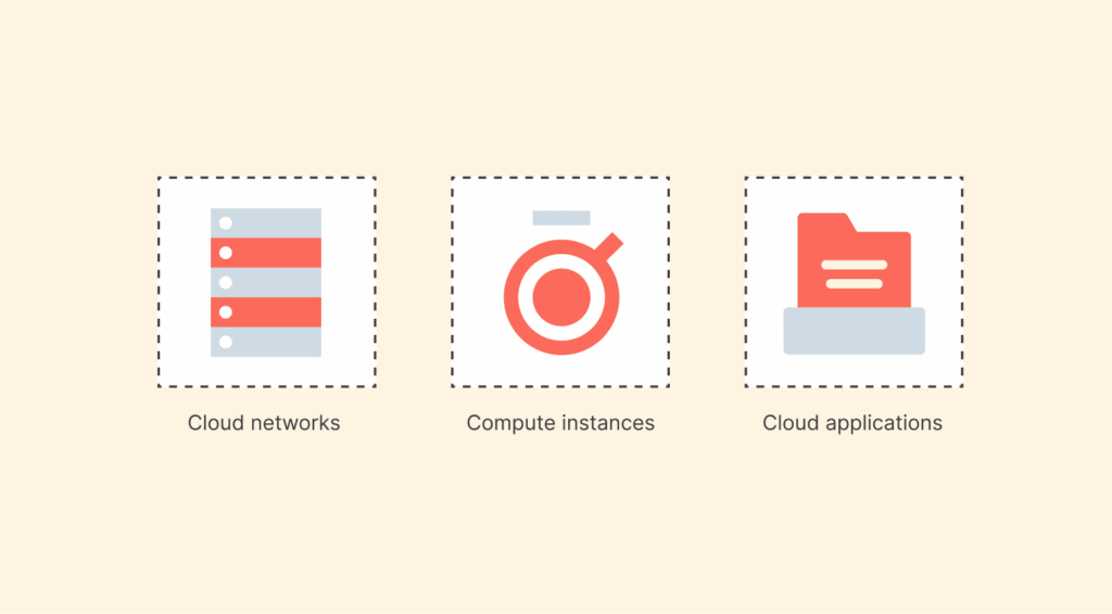 - Compute instances (Virtual Machines): Compute instances are the assets performing the work in the cloud. These assets must be secured against nasty malware and vulnerabilities. Because one can spin up and down cloud instances at any moment, your IT team must always see them and secure them under a strict policy.
