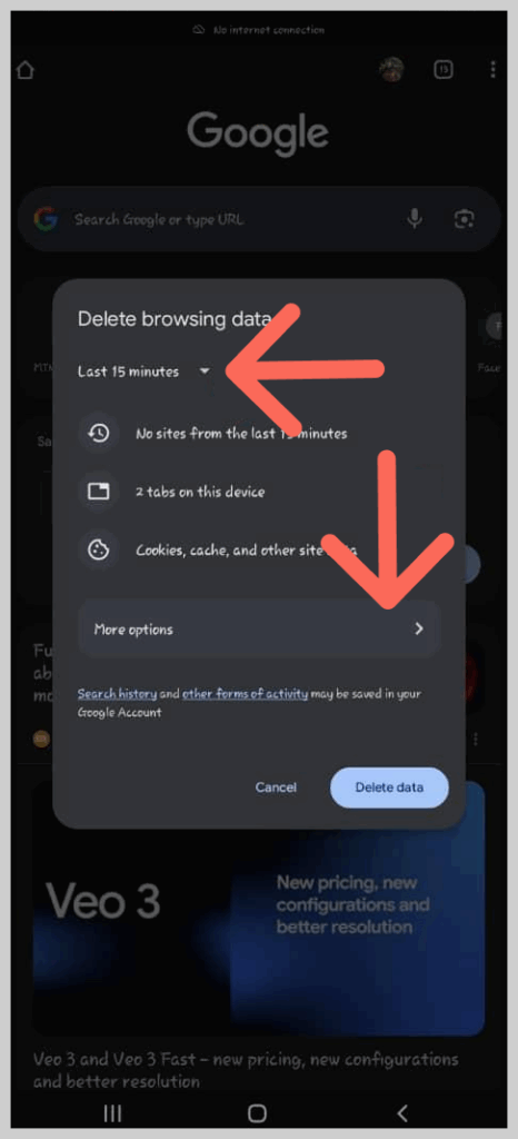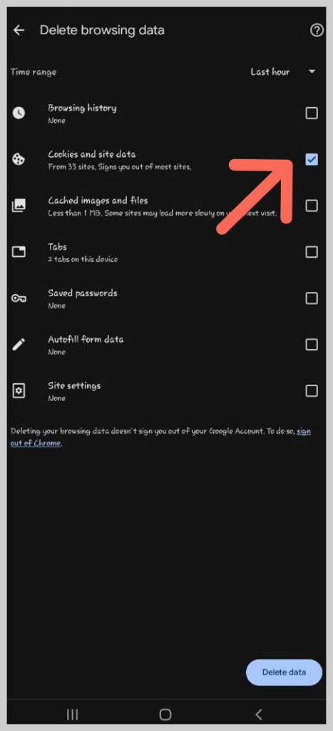 For the desktop version, just press “Ctrl+Shift+Del”, select the time window, and check the box for cookies. Click on “Delete Data” to clear any residue of cookies and site data.