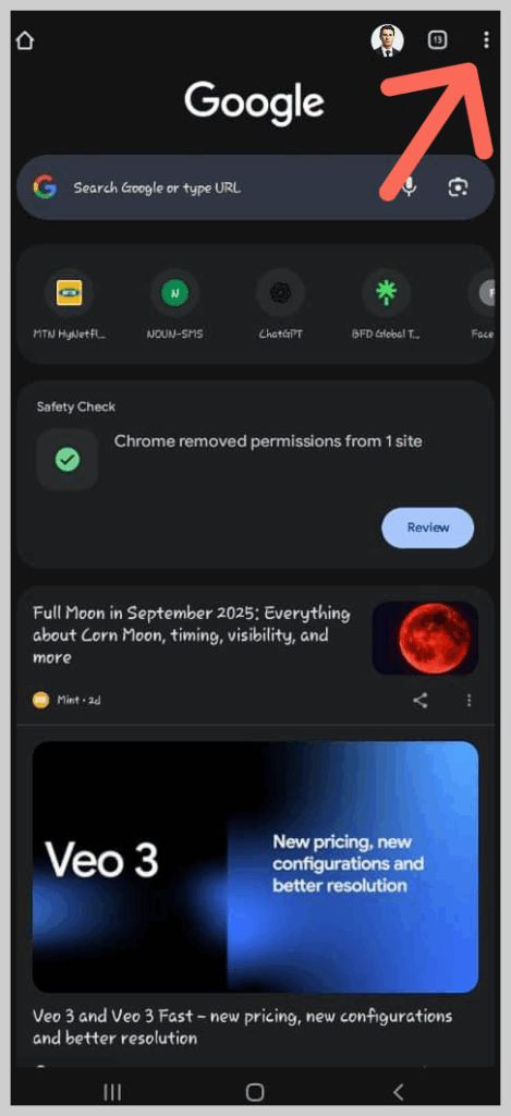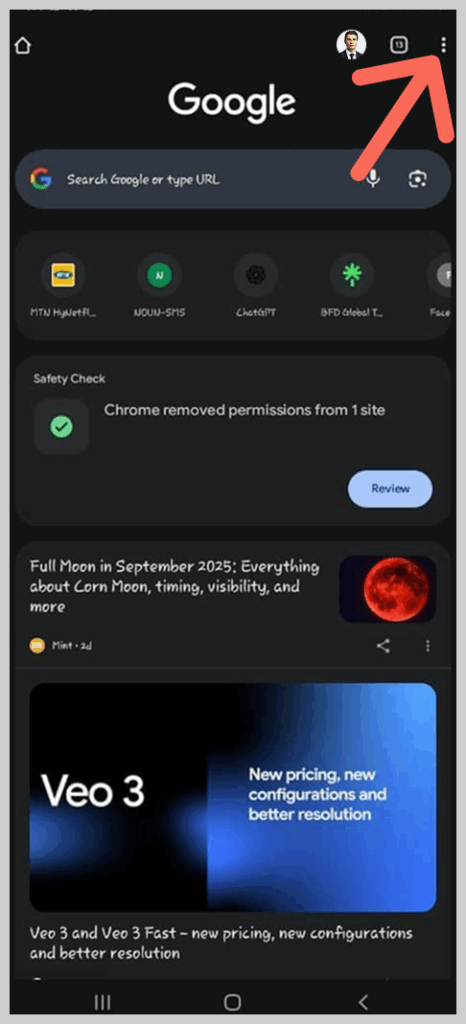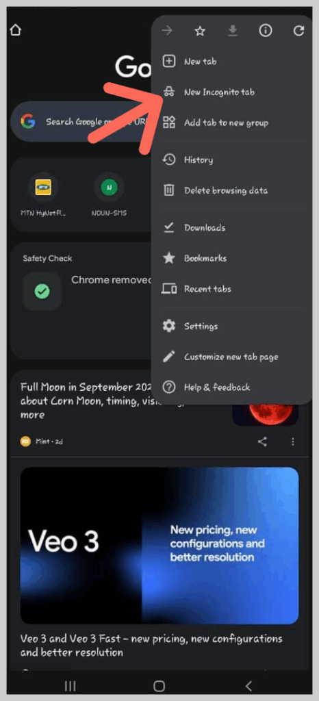 - Tap on the “three vertical dots” at the top right of the incognito page.
