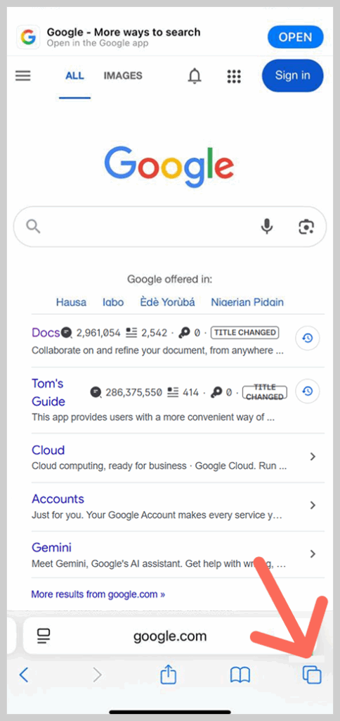 - Tap the tab icon (rectangle with a number inside) to view open tabs.