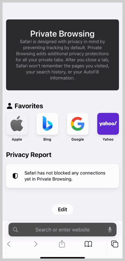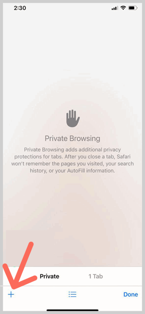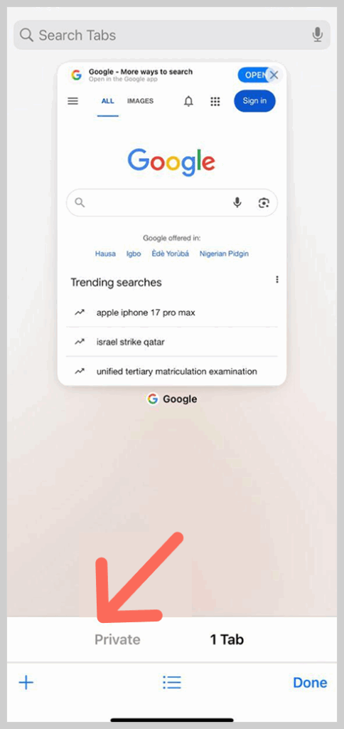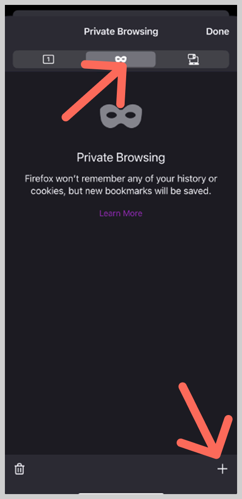 - Press the mask icon (Private Browsing icon) under “Open Tabs.”