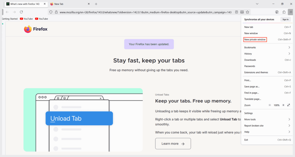 - Then, click “New Private Window” to open a Private Browsing tab and start browsing.