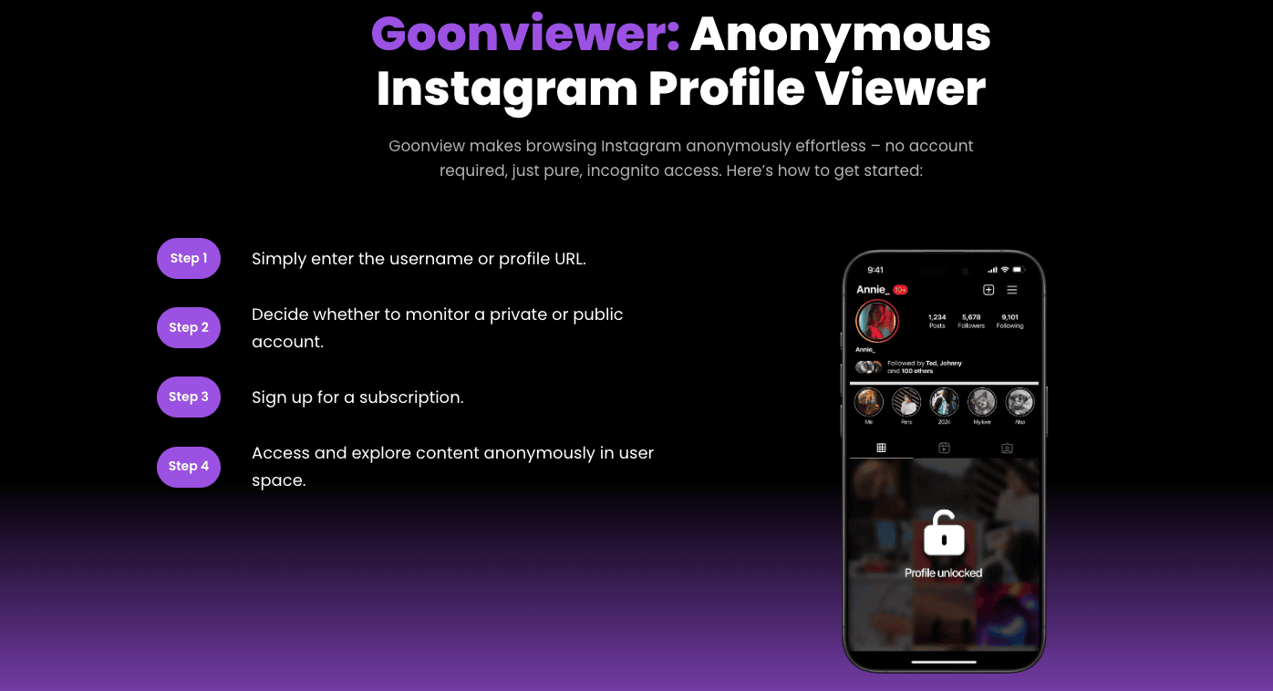 Goonview.com is a private Instagram checker website (a browser-based tool) that lets users browse public and private Instagram profiles, stories, and highlights without signing in. The platform claims to be a “go-to online photo viewer.”