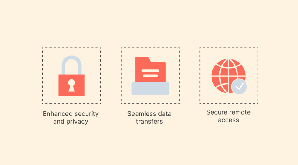 A P2P VPN is a type of VPN that uses P2P technology to establish secure, direct connections between devices. As a result, you get reduced network traffic and smooth large file sharing. It also provides robust security by encrypting your sensitive data, including your Internet Protocol (IP) address, during peer-to-peer connections.